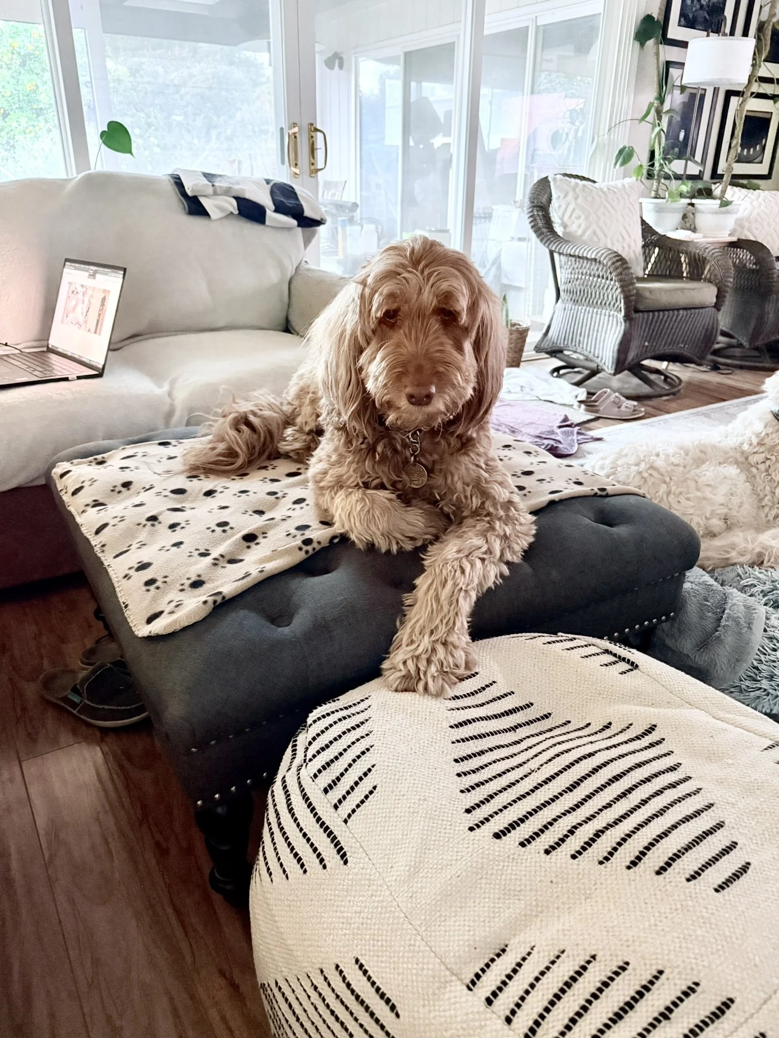 I found it amusing to see Zephyr, one of my Goldendoodles, lying on our fabric-tufted coffee table this morning. Granted, her blanket was spread out on the top of the table, so naturally, “I's fair game,” she would say—if she could talk. “Any surface with a blanket is doggy’s,” says her eyes in the image above.